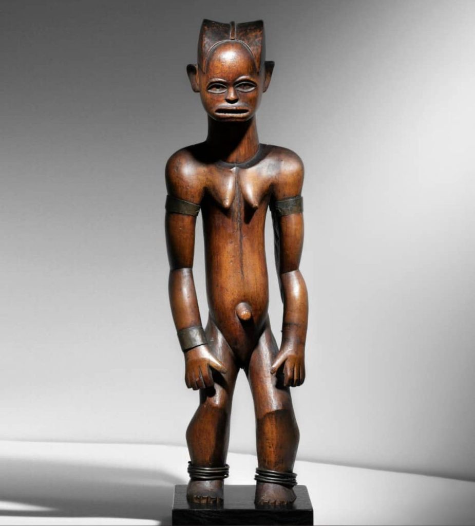 L’image présentée nous dévoile une figure de reliquaire Fang-Mabea, une sculpture typique de l’art africain, en particulier de la culture Fang du Cameroun. Cette pièce présente des caractéristiques distinctives qui la rattachent à ce groupe ethnique