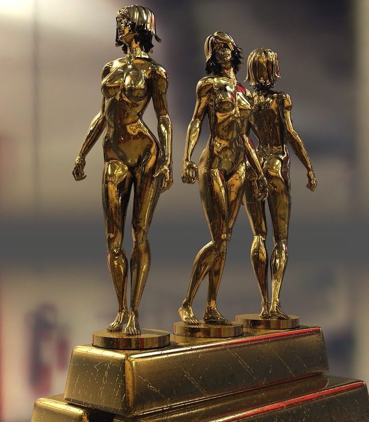 Socle commun: Le socle, également doré, unifie les trois figures et crée un sentiment d’unité. Il pourrait symboliser la terre, un autel, ou encore un piédestal divin.